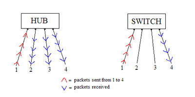 The reason that this packet sniffing worked was because we were using a hub, rather than a switch, to connect our computers in the network. Hubs broadcast the packets sent by one computer to all ports, so viewing the packet activity of another computer is quite simple (see Figure A). On the other hand, switches send the packets to only the desired port, so others on the network cannot listen in on your traffic. Switches have replaced hubs almost entirely because of this blatant security flaw, but hubs are still used in some situations such as where security is not a necessity.