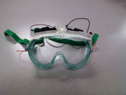 - To build our head tracking unit we obtained a pair of shop safety glasses from Mr.Avondet. We chose to use ones that were larger than necessary to give us extra surface area to attach the needed components (IR LEDs, battery holder, wiring).